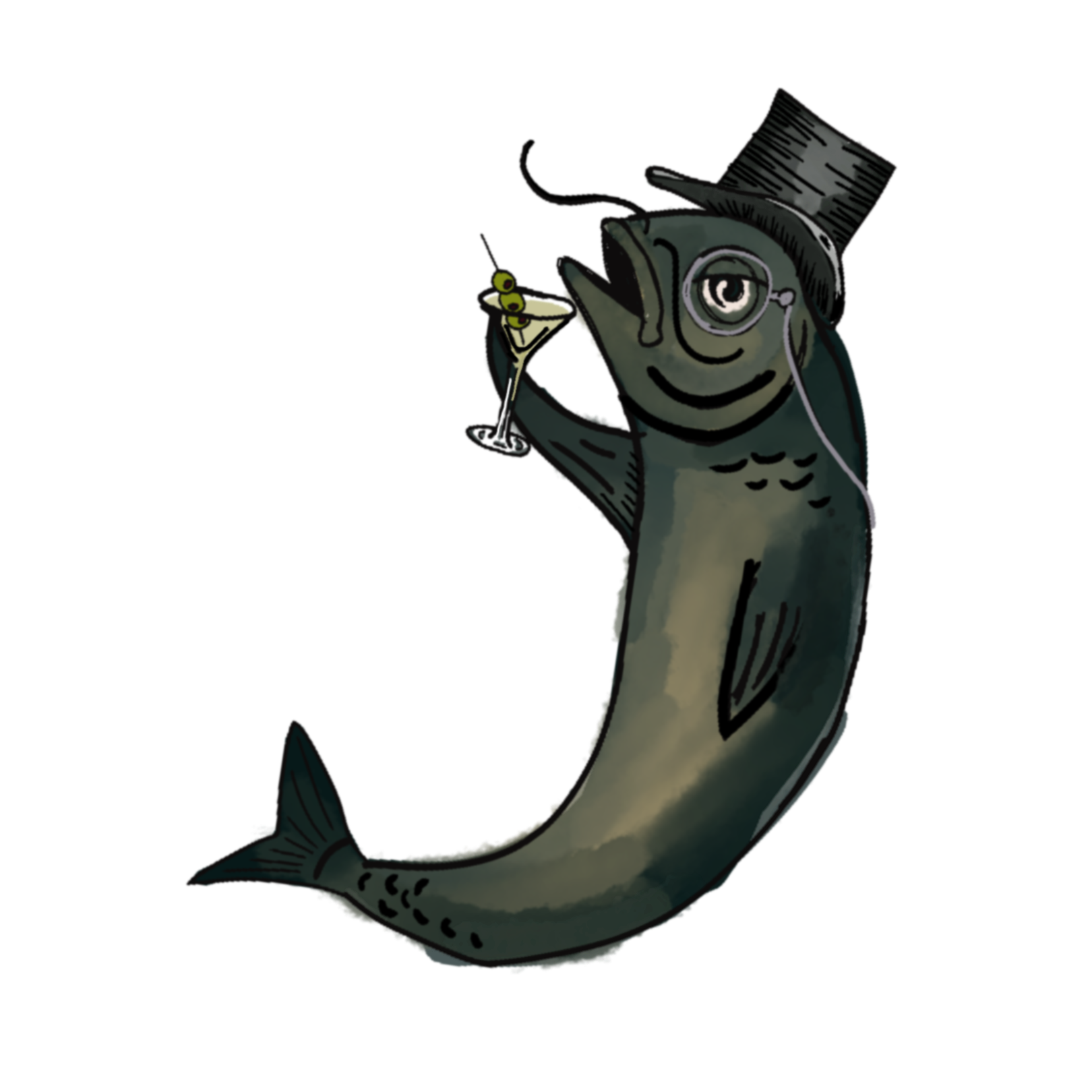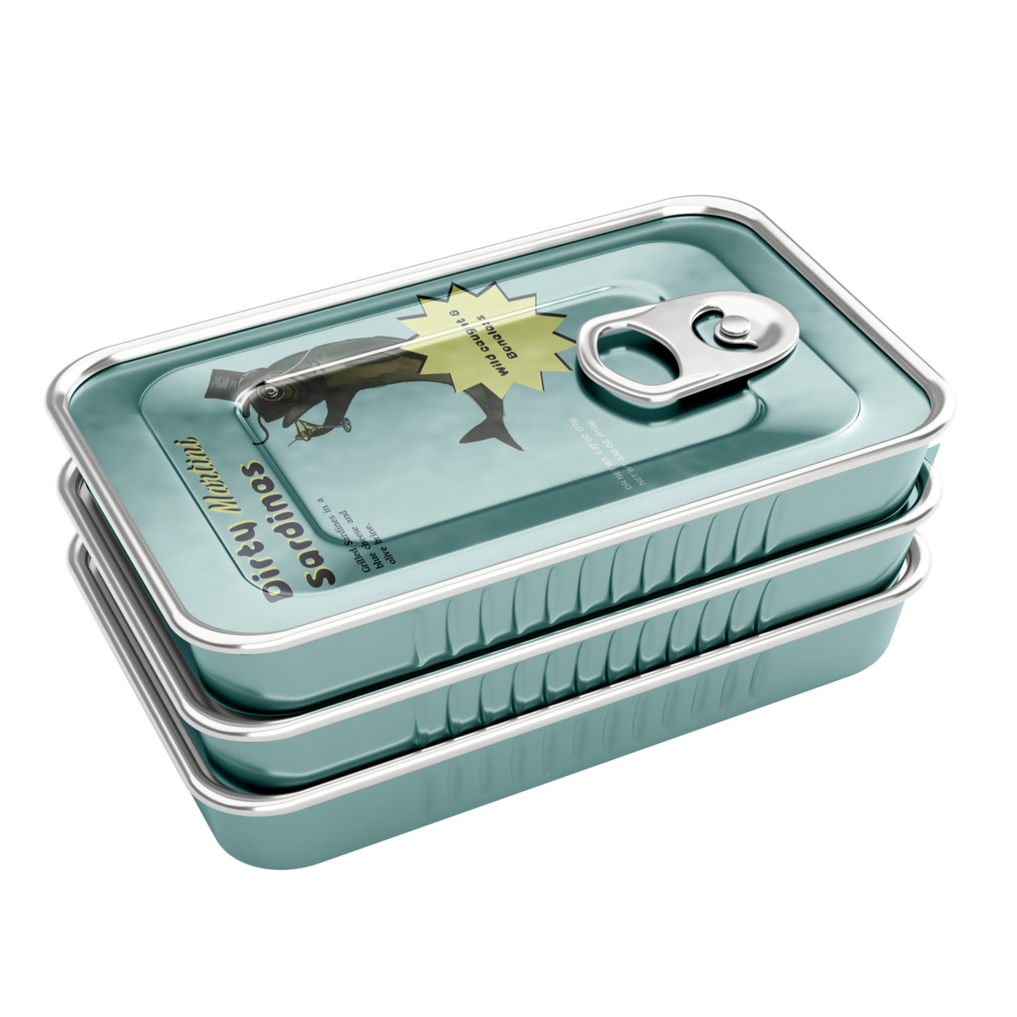 Conceptual packaging illustration capturing the bold, savory character of dirty martini and sardines.